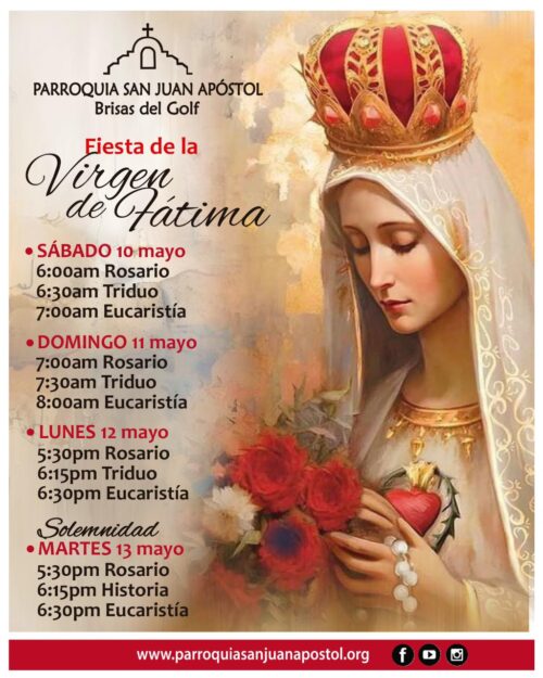 Con mucha alegría, queremos invitarte a celebrar juntos la Solemnidad en Honor a Nuestra Señora de Fátima en nuestra parroquia. 🙏✨ 🕊️ Comenzamos con el Triduo preparatorio:📅 Horarios de celebración: ➡️Sábado 10 de mayo:…