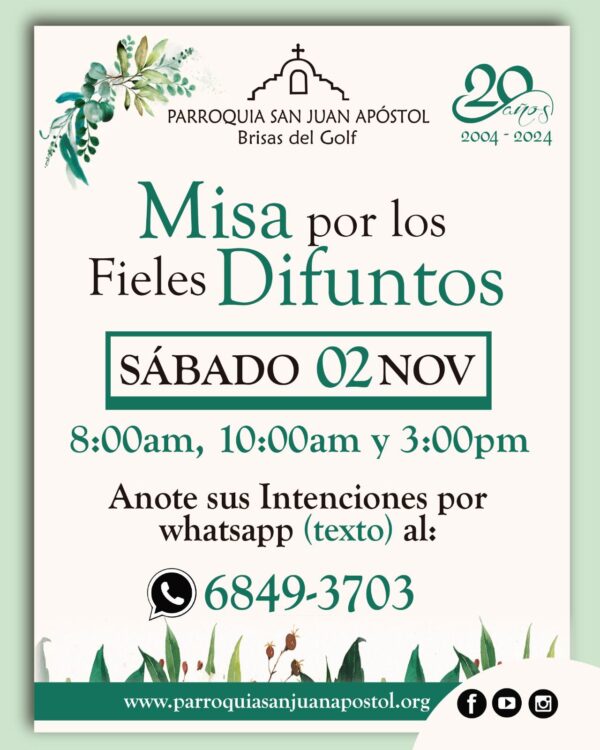 Te invitamos a la Misa por los Fieles Difuntos 🙏🕊️ el sábado 2 de noviembre. Acompáñanos a orar por el eterno descanso de nuestros seres queridos en las siguientes Eucaristías: 🕗 8:00 a.m.🕙 10:00…