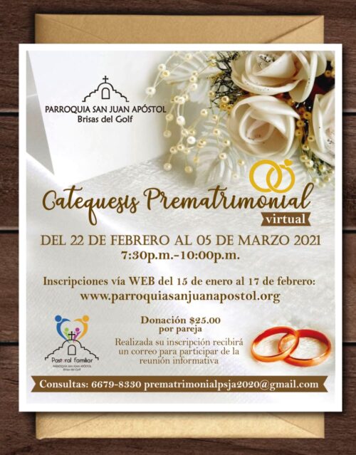 Se acerca nuestra próxima Catequesis Prematrimonial Virtual 💻 dirigida a todas las parejas de novios 👩❤️👨 y casados civilmente que puedan 💒 sacramentarse ✝️. Del 15 de enero al 17 de febrero estaremos recibiendo…