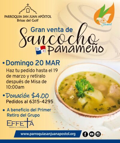 A beneficio del Primer Retiro del Grupo EFFETÁ, te invitamos a apoyar la Gran Venta de Sancocho Panameño. Haz tu pedido al 6315-4295, hasta el 19 de marzo y retíralo después de Misa de…