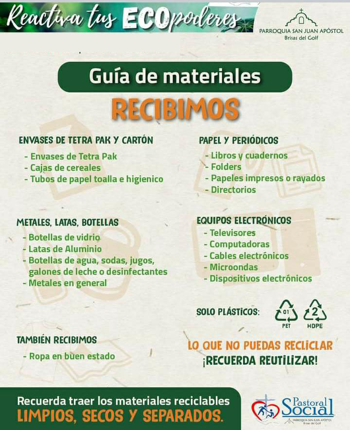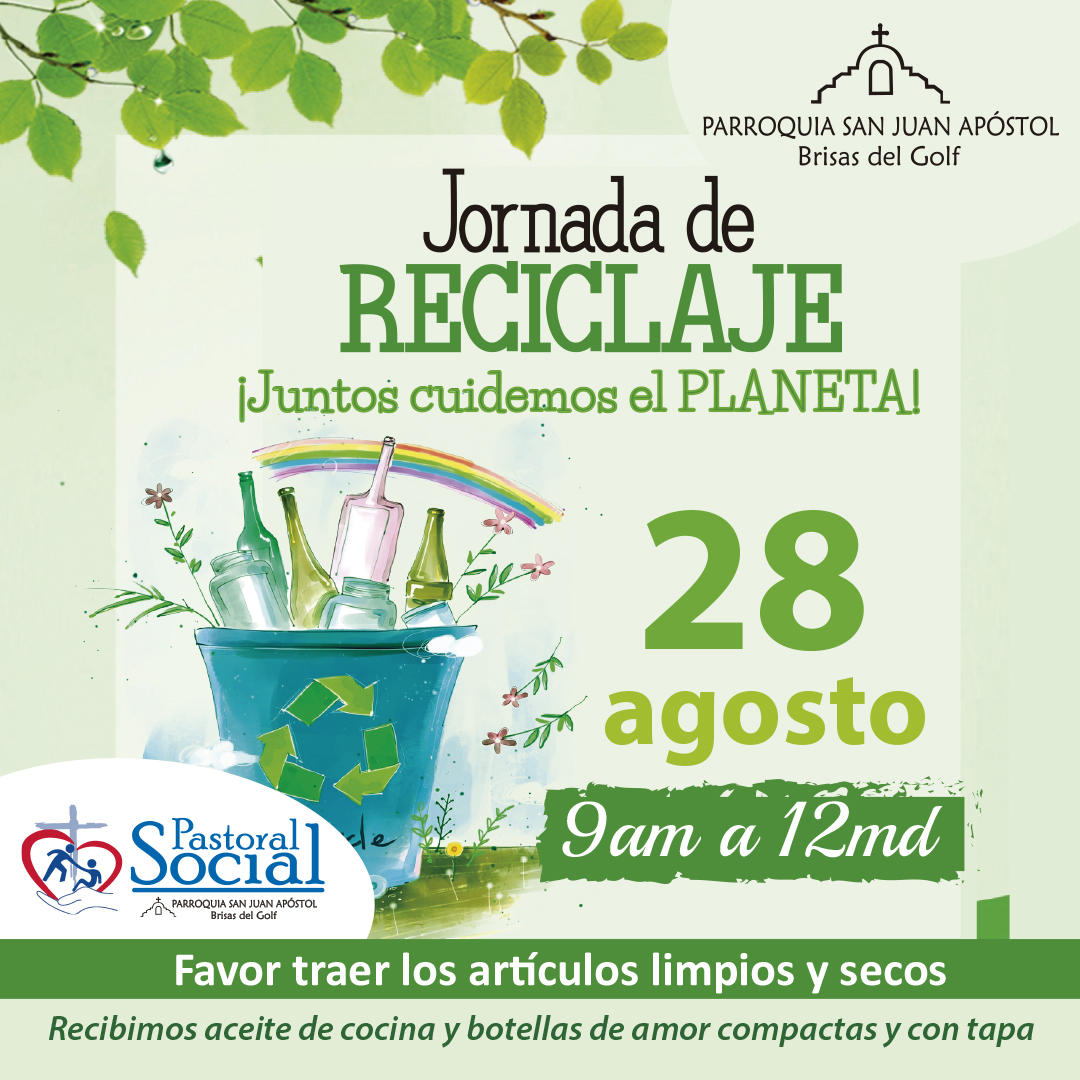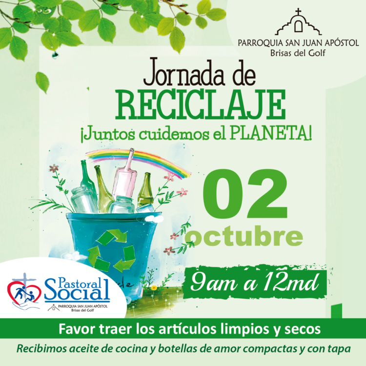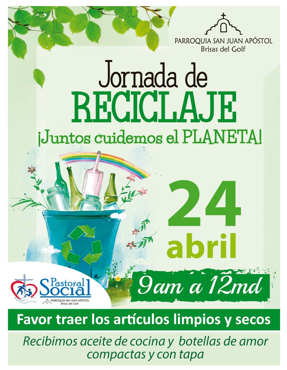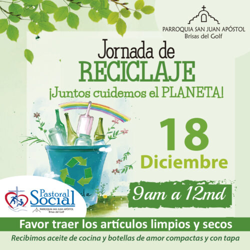 Estimados hermanos, la Pastoral Social de la Parroquia San Juan Apóstol, quiénes diligentemente organizan las Jornadas de Reciclaje mensualmente, se encuentran reestructurando esta actividad, por lo que oportunamente estaremos comunicando las nuevas fechas.