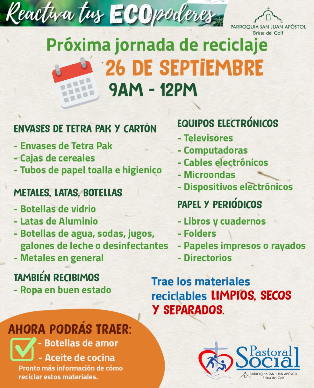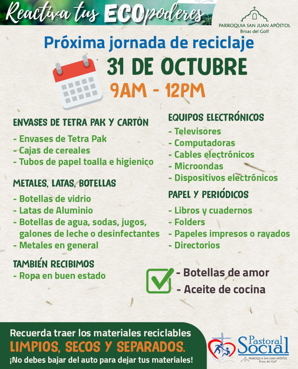 NUEVA FECHA 🗓 Este 31 de octubre te esperamos para la nueva Jornada de Reciclaje en nuestra parroquia 🎉 a partir de las 9 AM ♻️ 🔹 Recuerda que ahora también podrás traer aceite…