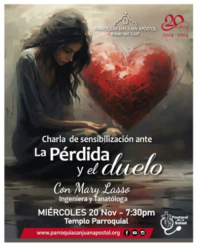 La Parroquia San Juan Apóstol y la Pastoral de Salud le extiende una cordial invitación a participar de la charla de formación con el tema «SENSIBILIZACIÓN ANTE LA PÉRDIDA Y EL DUELO » ofrecida por la Tanatologa Mary Lasso.