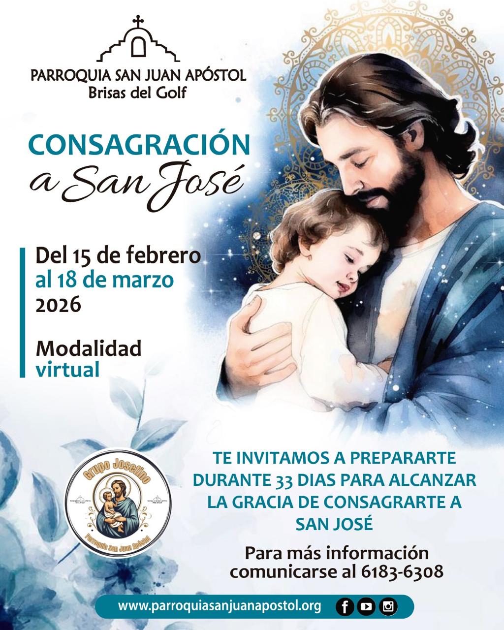 La Parroquia San Juan Apóstol – Brisas del Golf invita cordialmente a toda la feligresía a participar en la Consagración a San José, un camino espiritual de preparación de 33 días que nos permitirá crecer en la fe, fortalecer nuestra vida familiar y acercarnos más al ejemplo de humildad, obediencia y amor de San José.