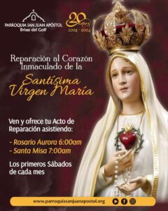 La Parroquia San Juan Apóstol invita a toda la comunidad a unirse al Acto de Reparación al Inmaculado Corazón de la Santísima Virgen María, una hermosa devoción mariana que se realiza los primeros sábados de cada mes.