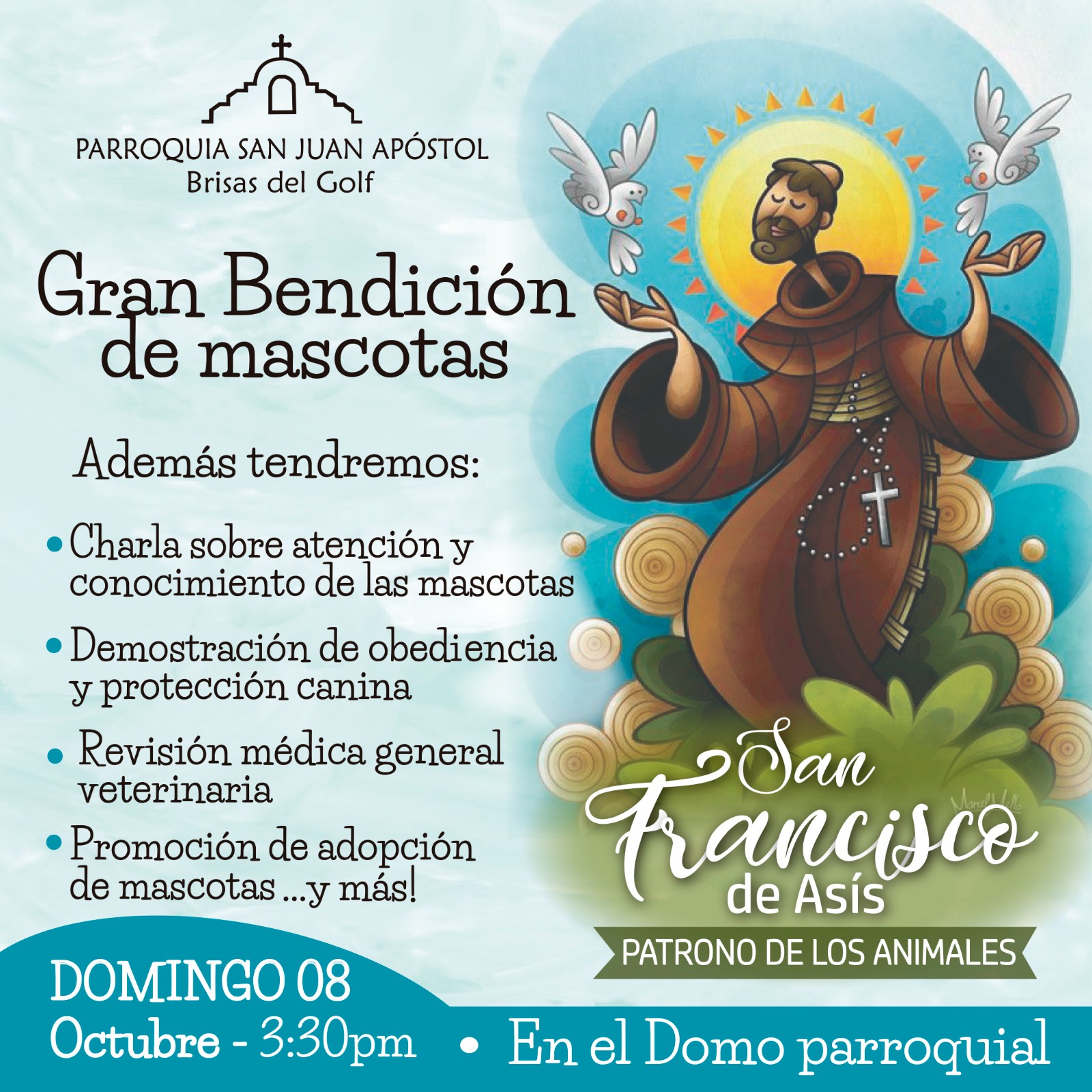 En conmemoración a San Francisco de Asís, quien nos dejó como enseñanza que debemos proteger y cuidar la naturaleza y por supuesto a los animales, a quienes él llamaba «hermanos», nos alegra invitarlos a la GRAN BENDICIÓN DE MASCOTAS a realizarse el DOMINGO 8 DE OCTUBRE a las 3:30pm en el área del Domo parroquial.