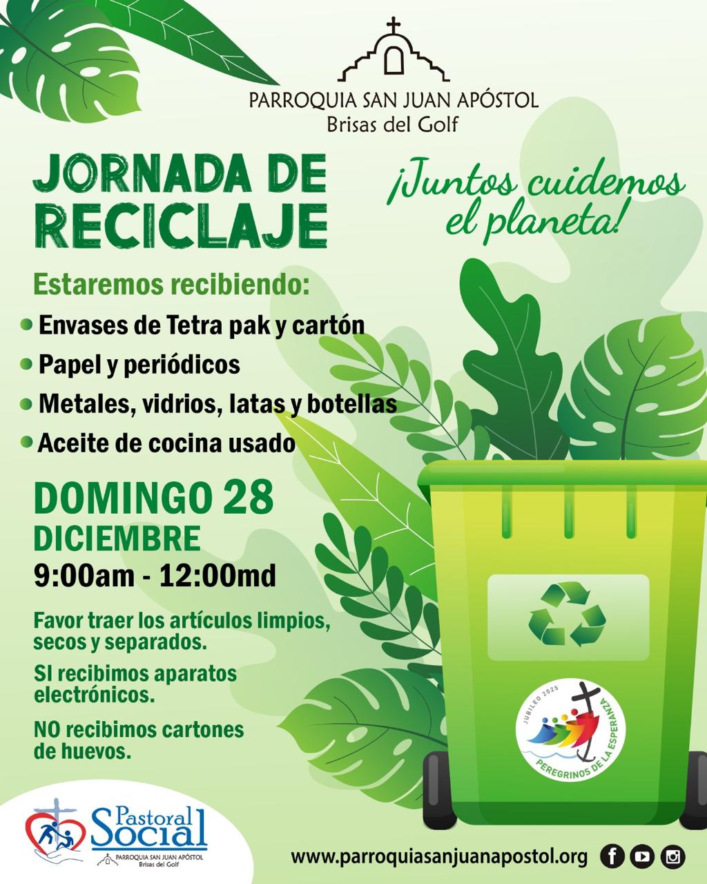 El próximo domingo 28 de diciembre de 2025, de 9:00 a.m. a 12:00 m.d., tendremos una Jornada de Reciclaje en los predios de la Parroquia San Juan Apóstol – Brisas del Golf, organizada por la Pastoral Social.