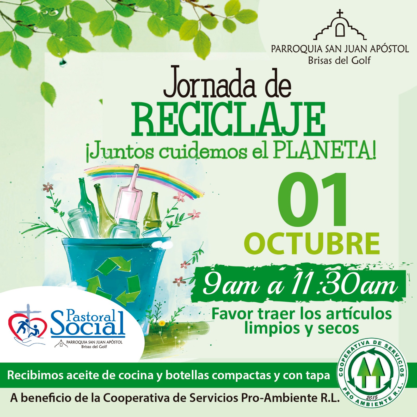 El domingo 1 de octubre, en horarios de 9 a.m. a 11:30 a.m. tendremos una Jornada de Reciclaje, organizada por nuestros hermanos de la Pastoral Social.