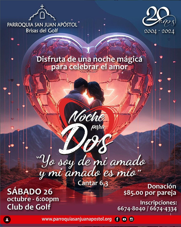 No te pierdas esta 𝐍𝐎𝐂𝐇𝐄 𝐏𝐀𝐑𝐀 𝐃𝐎𝐒 👩🏻❤️💋👨🏻. Puedes separar tu cupo ¡𝐝𝐞𝐬𝐝𝐞 𝐡𝐨𝐲! abonando tu boleto 🎟️ después de las Eucaristías, en la oficina parroquial o con cualquier hermano de la Pastoral Familiar.