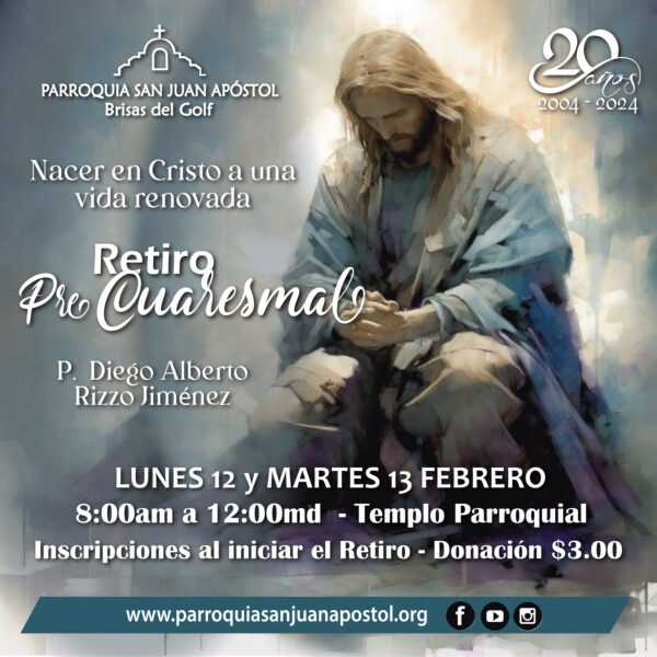 ¡Les extendemos una cordial invitación para unirse a nosotros en el Retiro Pre Cuaresmal que se llevará a cabo en el Templo Parroquial los días lunes 12 y martes 13 de febrero, de 8:00 am a 12:00 md!