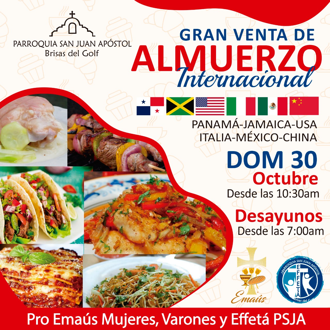Te invitamos a la GRAN VENTA DE ALMUERZO Internacional 🇵🇦 🇯🇲 🇺🇸 🇮🇹 🇲🇽 🇨🇳 pro retiro Emaus. 📅 Domingo 30 Octubre, desde las 10:30 am 🥓 Desayunos, desde las 7:00 am