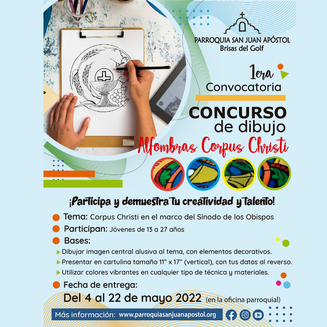 Te invitamos a la 1era Convocatoria de Concurso de Dibujo #AlfombrasCorpus Christi en nuestra Parroquia! Datos Importantes Tema: Corpus Christi en el marco del Sínodo de los Obispos Participan: Jóvenes de 13 a 27…