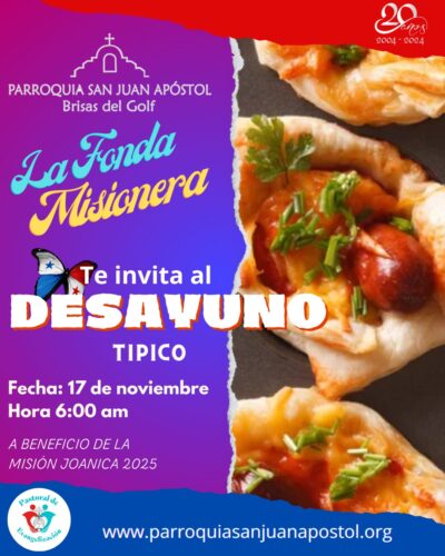 ¡Acompáñanos a compartir un delicioso Desayuno Típico Panameño este domingo 19 de octubre, desde las 6:30 a.m., en nuestra Parroquia San Juan Apóstol, ubicada en Brisas del Golf. Ven con tu familia y disfruta…