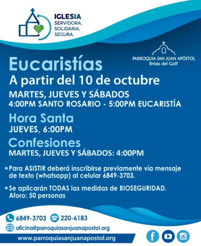 Eucaristías (en la parroquia) Martes, Jueves y Sábados: 4:00 p.m. – Santo Rosario 5:00 p.m. – Eucaristía Hora Santa (en la parroquia) Jueves: 6:00 p.m. Confesiones (en la parroquia) Martes, Jueves y Sábados: 4:00…