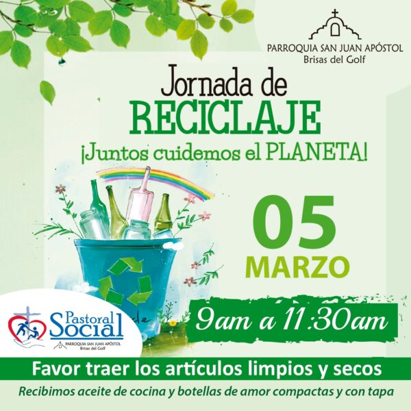 ♻️ ¡Juntos cuidemos el PLANETA! Mañana domingo 5 de marzo, en horarios de 9 a.m. a 11:30 a.m. tendremos una Jornada de Reciclaje, organizada por nuestros hermanos de la Pastoral Social. Participa trayendo: